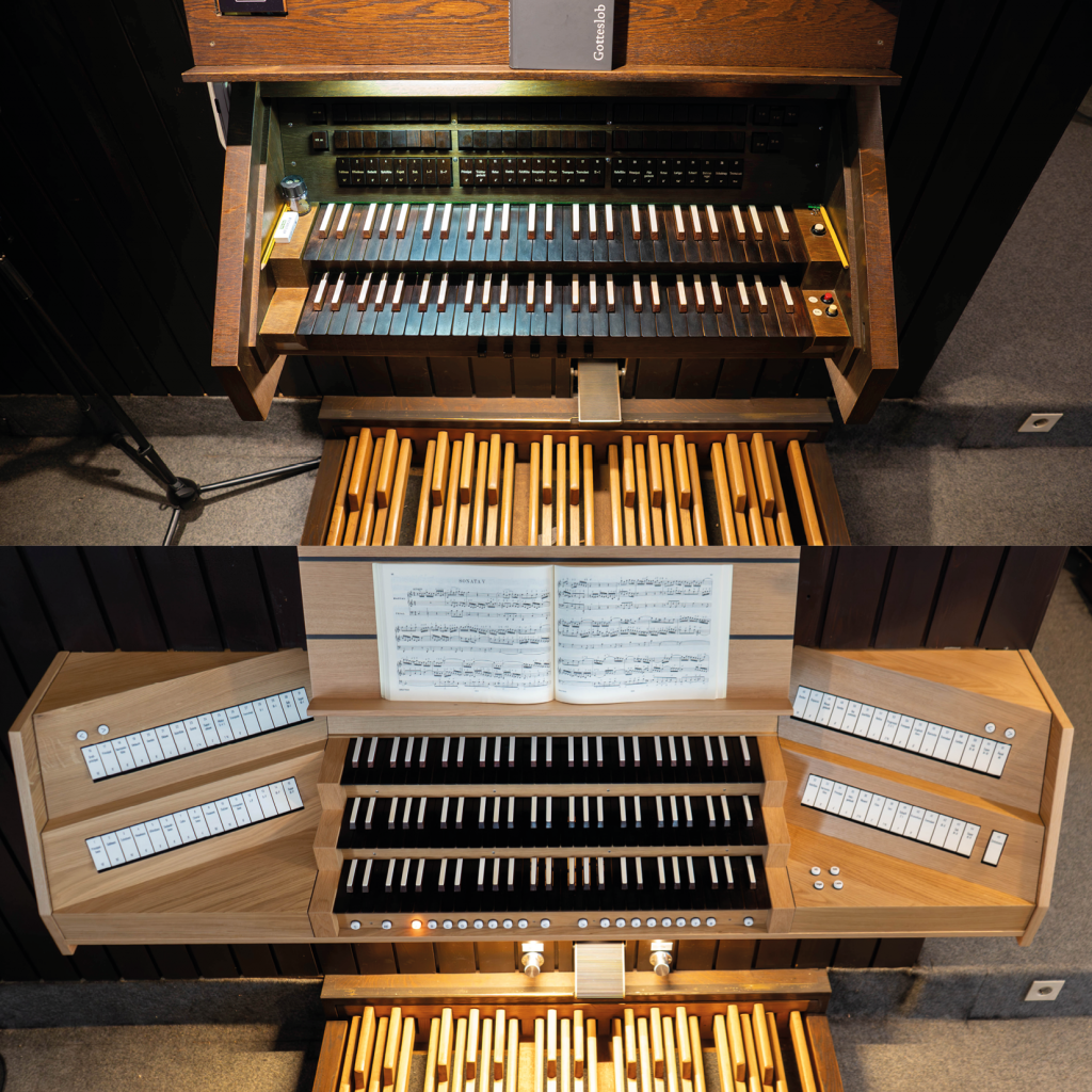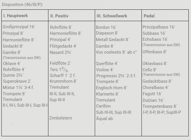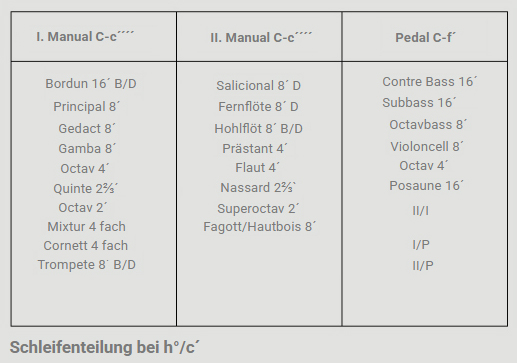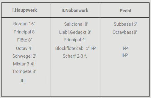 Nach Reinigungs- und wichtigen Reparaturarbeit von uns im Jahre 2014 änderten wir 2019 die Disposition in den heutigen Zustand.